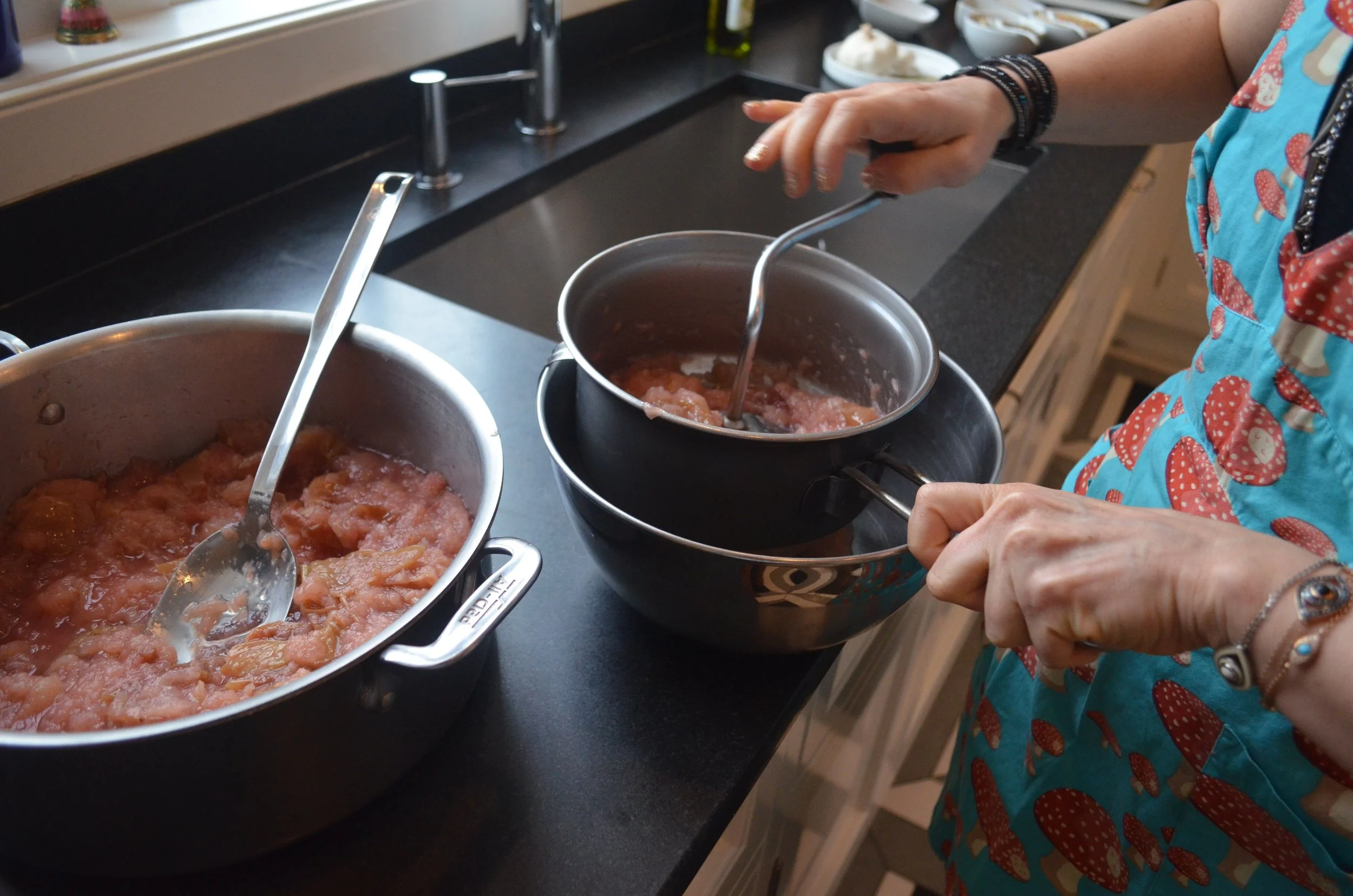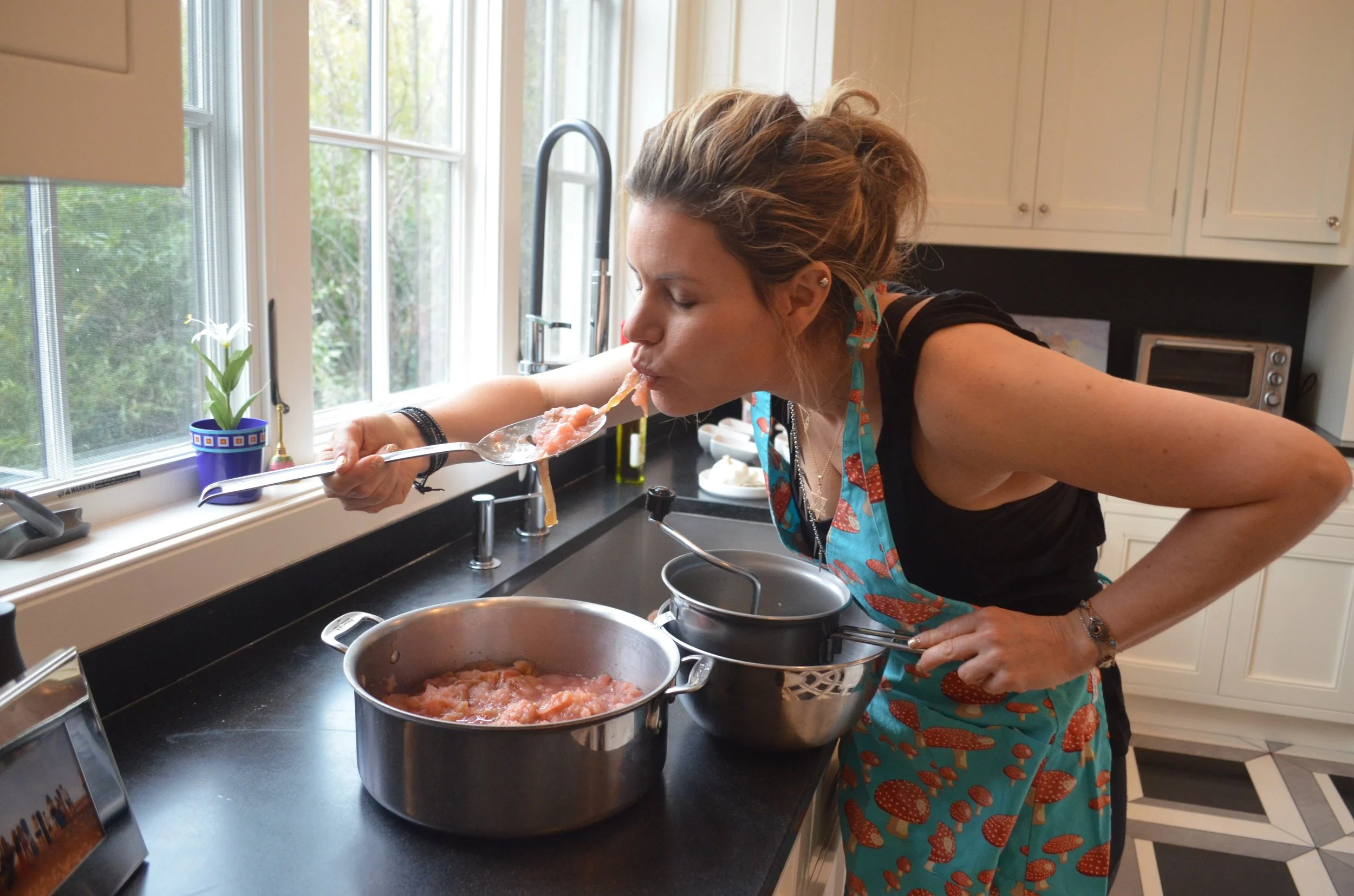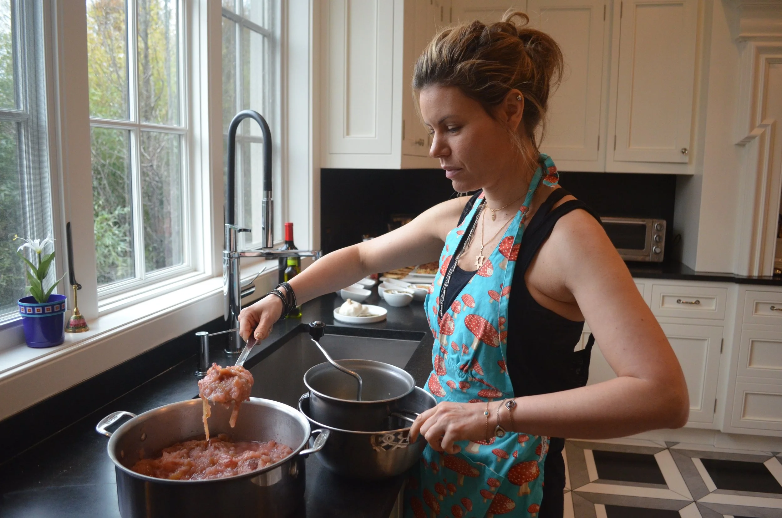 Spoon 🍎 mush into the foley mill, which hooks on to your large mixing bowl with two hooks. Mill should be securely fitted to bowl or you'll go nuts readjusting. Turn mill by hand. The blade will magically keep the skin on top whilst (needed to say this word) the mush falls through the holes into your bowl. It sounds annoying but it's fun! It keeps in a container in the fridge for about a week and a half. Stay tuned for next week, when we churn our own butter...