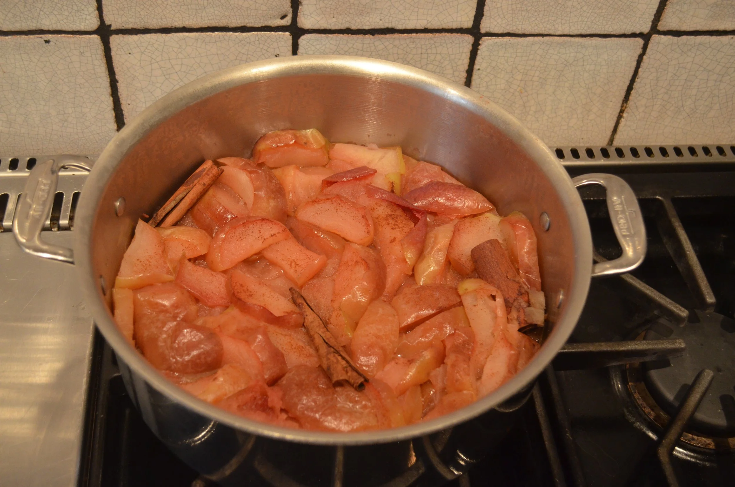 Place three cinnamon sticks around the pot, wedging them in amongst the apples. Sprinkle a little cinnamon on top. Not aggressively. Cover pot. Bring to a boil then lower heat to a simmer for an hour.