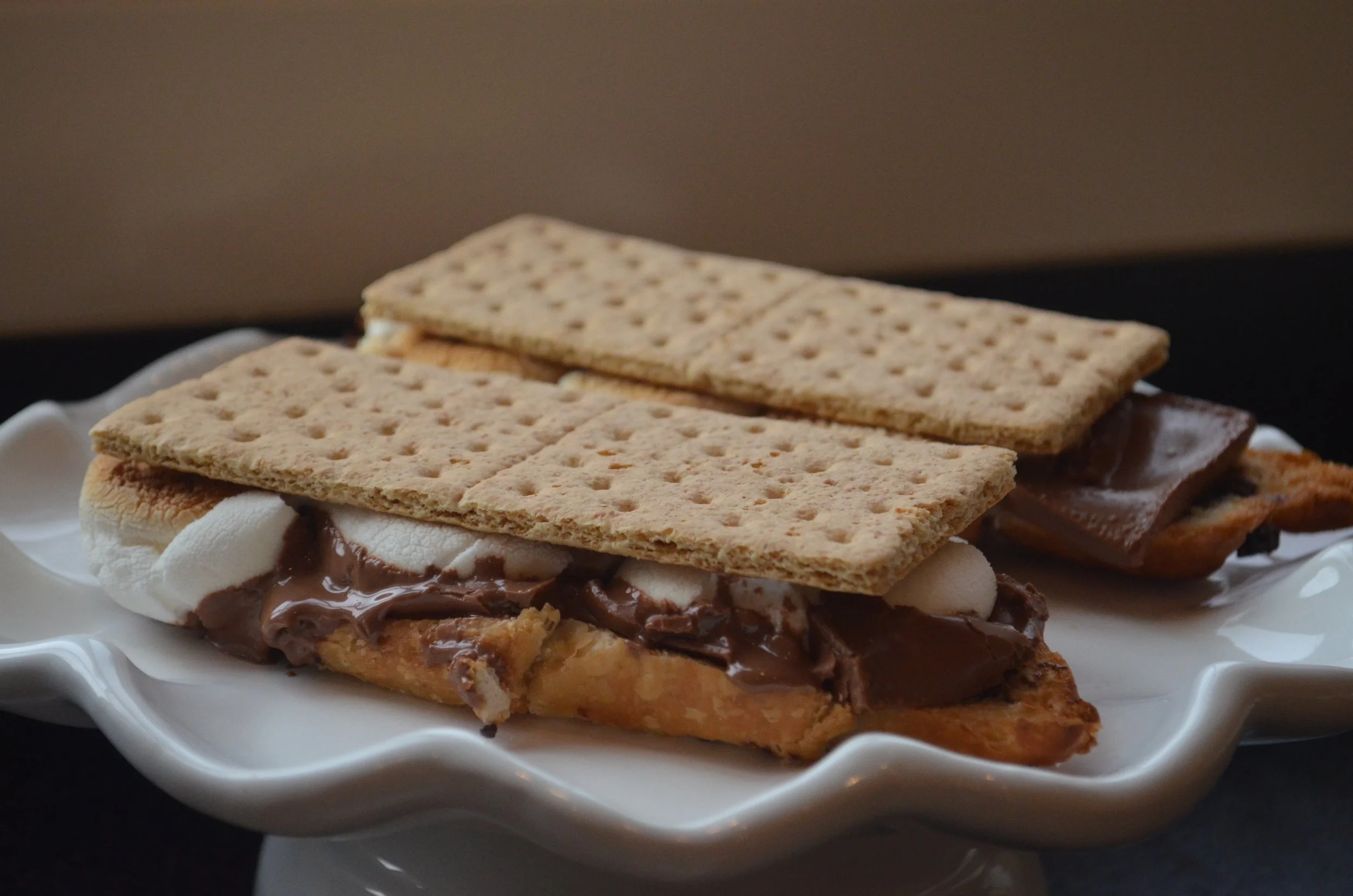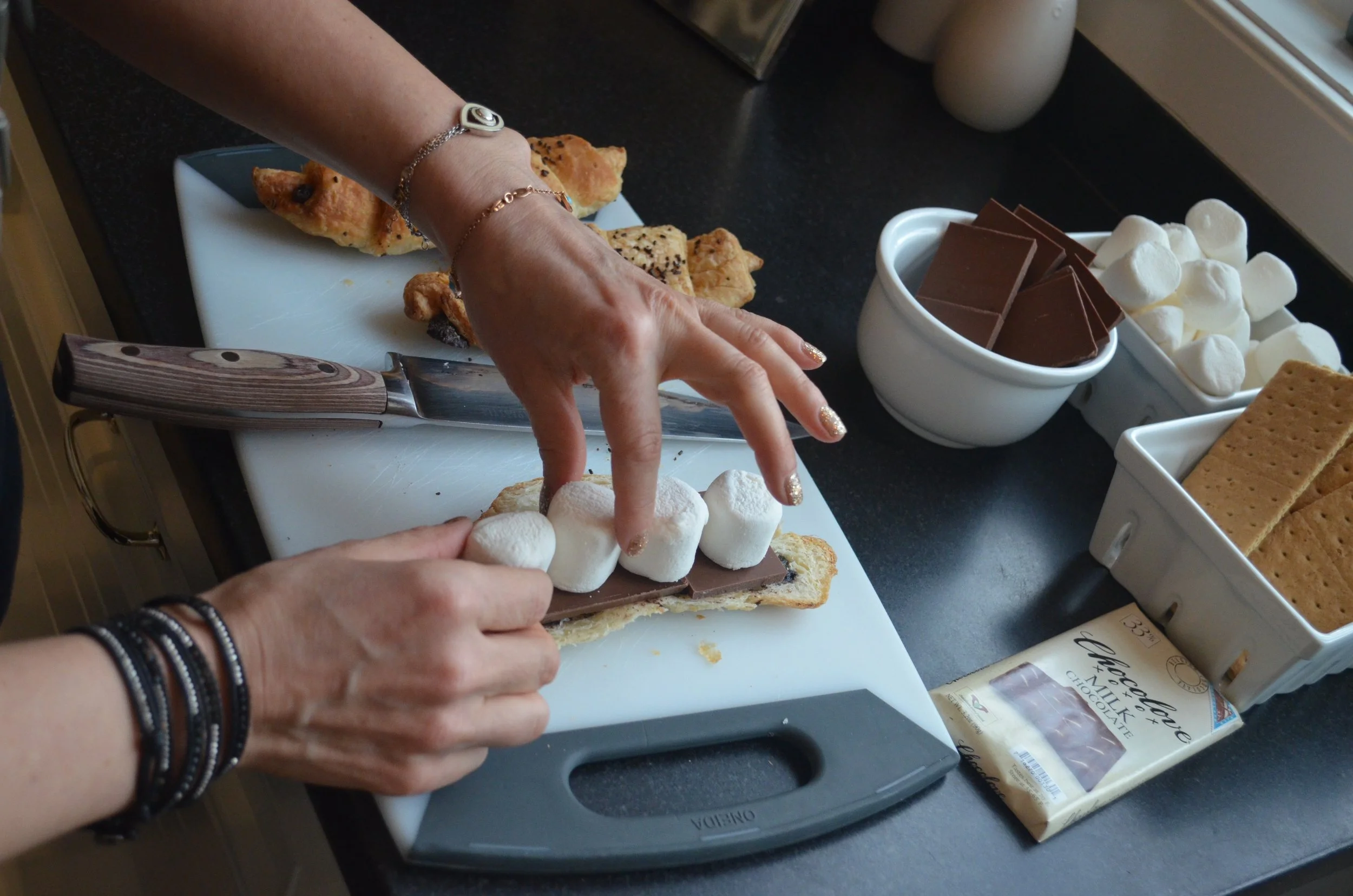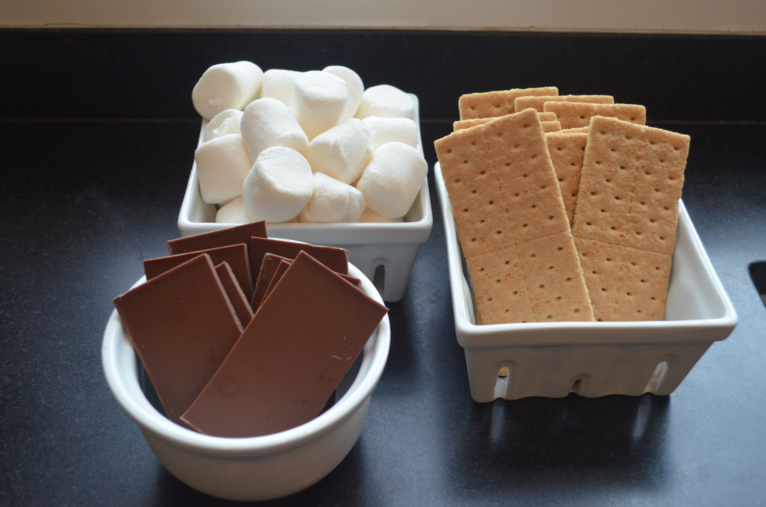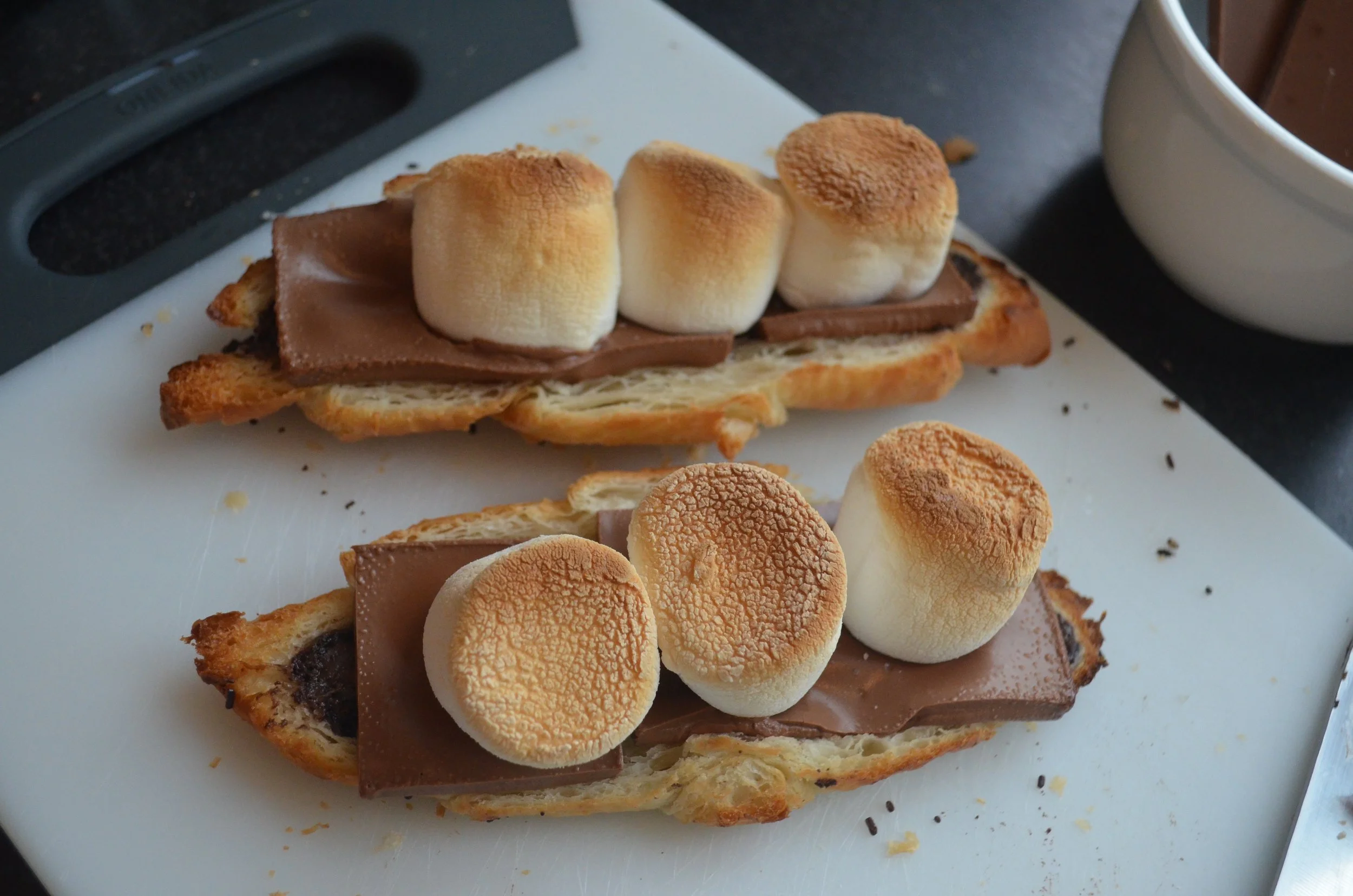 I sliced them lengthwise, put them crust down in a tin pan, placed a layer of milk chocolate, a layer of marshmallows (you could use small or big), and put in my oven for I think three minutes.