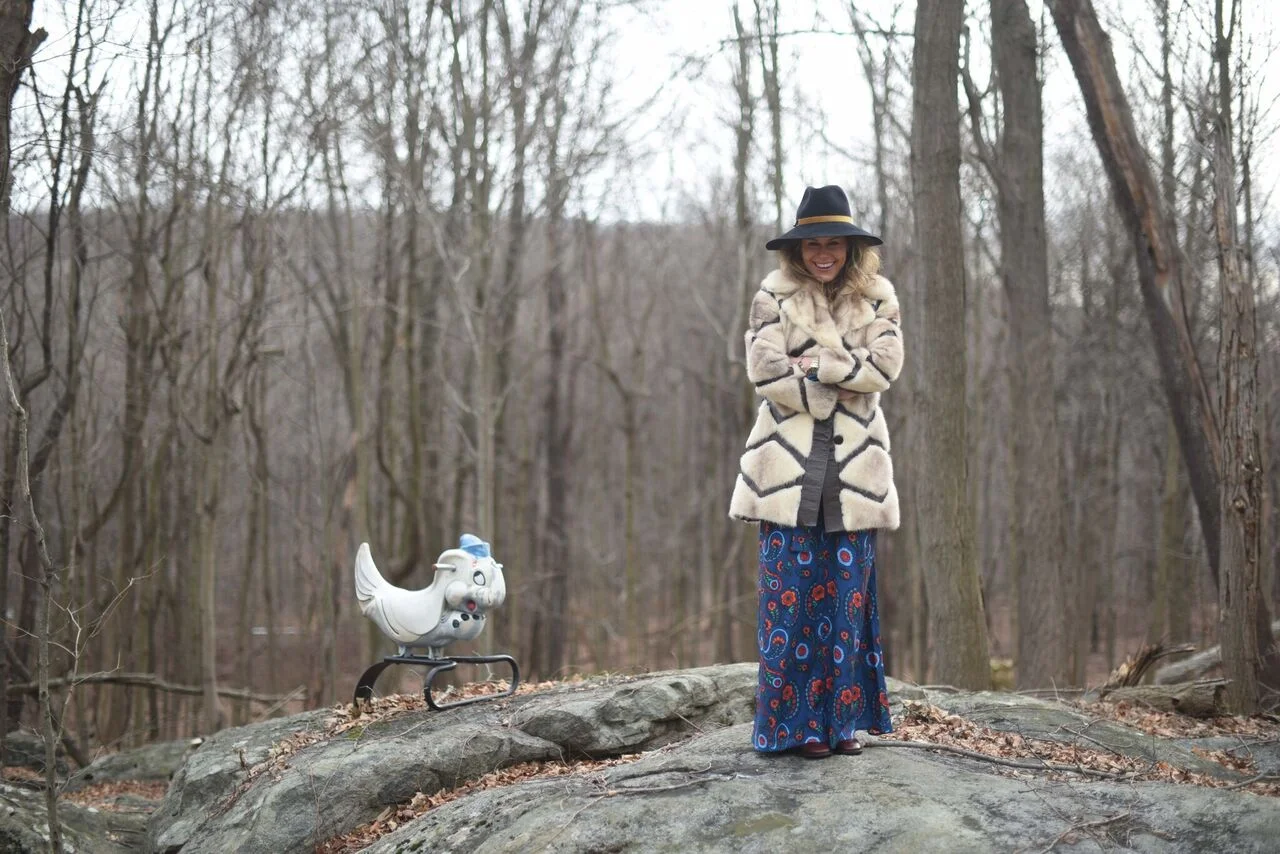 Back to the frigid woods serving as a closet and dressing room... This outfit was thrown together because I was so cold and was rapidly losing all feeling in my body, as well as the ability to make decisions, and it was easy at that point. And not covered in dirt. It's a six-year-old Issa dress I bought in London when I went for the Olympics. I instantly loved its kimono feel and shape. It is very 60's glam. Something a socialite would have worn hosting a dinner party with a martini in her hand and a cigarette in the other. Isabel Marant ankle cowboy boots, my favorite addition this season to my wardrobe, my mother's ancient fur and leather coat that my grandparents made her in the 70's (forever a staple in my closet), and this new rad hat from Eugenia Kim. That makes me feel like Carmen Sandiego. Had I had use of my fingers and more clarity of mind, I'd have piled on gold necklaces and rings. Instant cool. If ever I'd need an album cover shot, this photo would be it. Glamor and comfort can absolutely belong in the same uterus. As concepts, they may be fraternal twins, but they complement each other beautifully.
