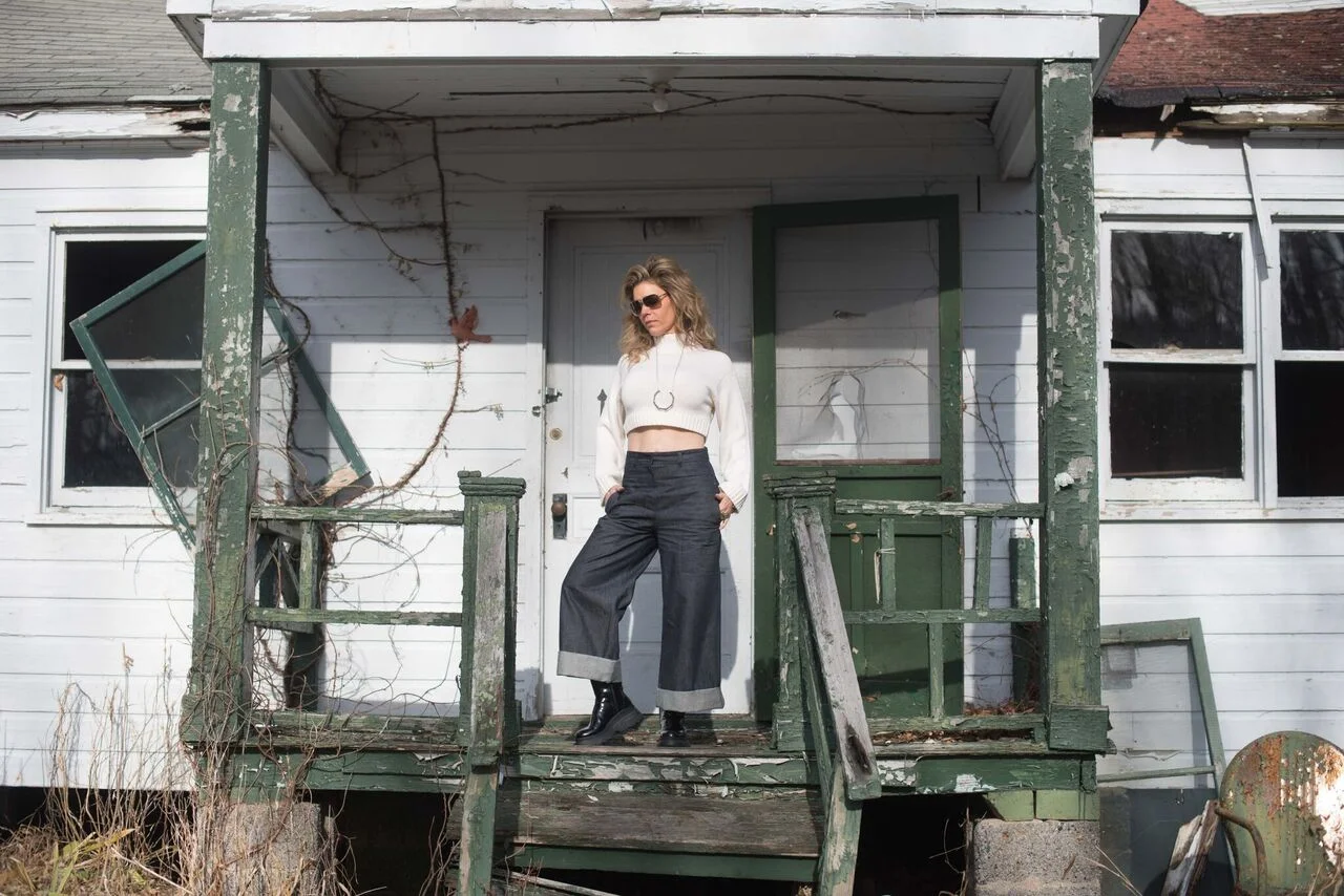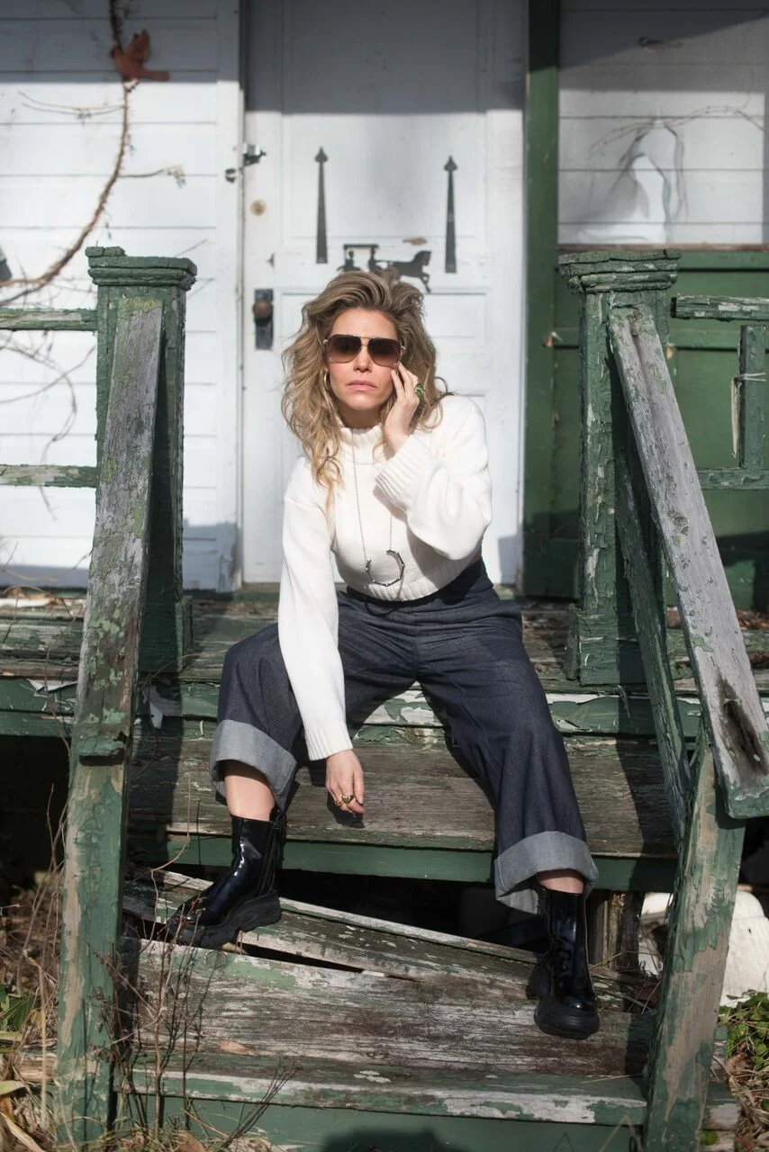 The cropped cream turtleneck sweater is soft and sexy. It's an essential building block of cold weather yumminess. It's clean and crisp, and softly accompanies the statement of the denim. These chunky, military style, black patent leather boots blew my mind. I loved their badass look. I love wearing them with long skirts,or a feminine slip dress for effortless contrast. They're also practical when doing a photo shoot in muddy woods😝. My necklace, a favorite of mine,is from W. Britt. Brit, who btw is an incredibly lovely woman and dear friend, uses industrial looking materials, which makes her pieces so unique and fabulous. I like things that look like other things, so if I'm wearing something that looks like it came from a hardware store then 👏🏻.