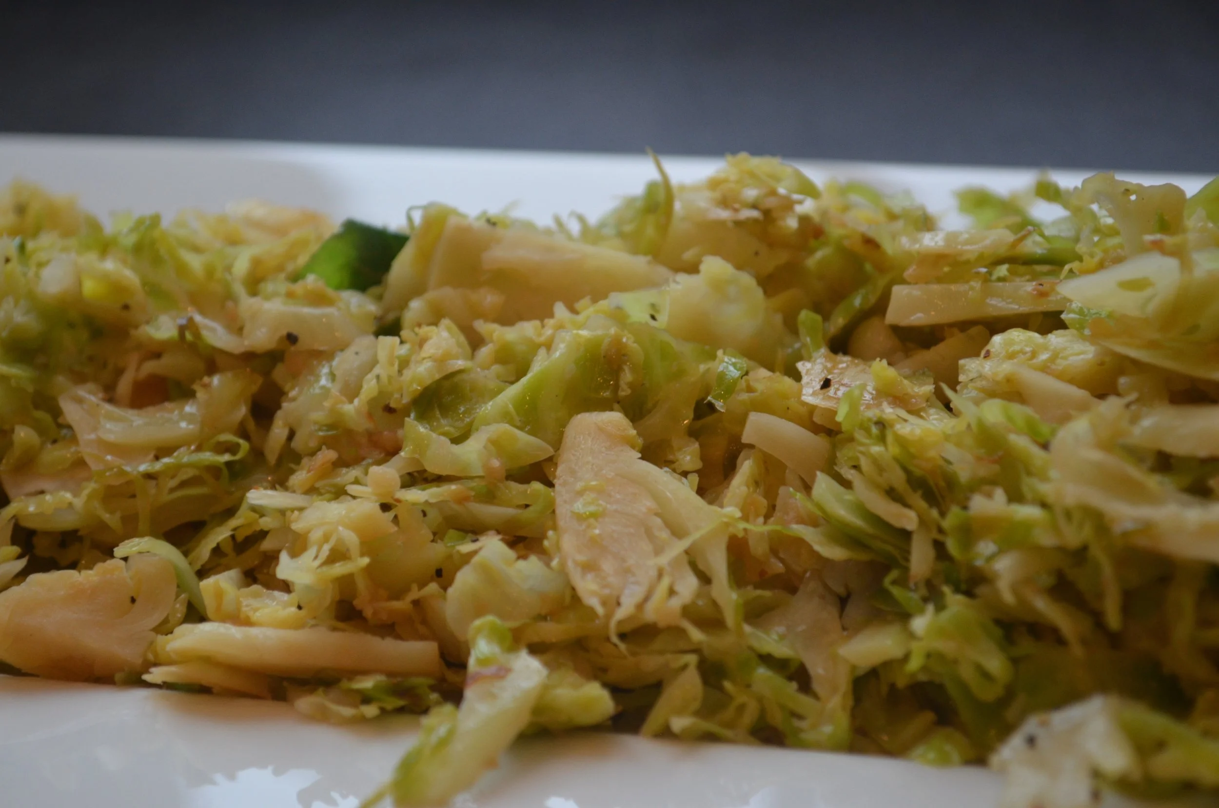 Heat up the oil and add 4 minced garlic cloves. The garlic will cook fast, when it starts to brown, deglaze the pan with two tbsp white wine and stir well. The wine will evaporate shortly, but when it's half gone, dump in the shaved Brussel sprouts. Stir to coat , adding more oil as needed.