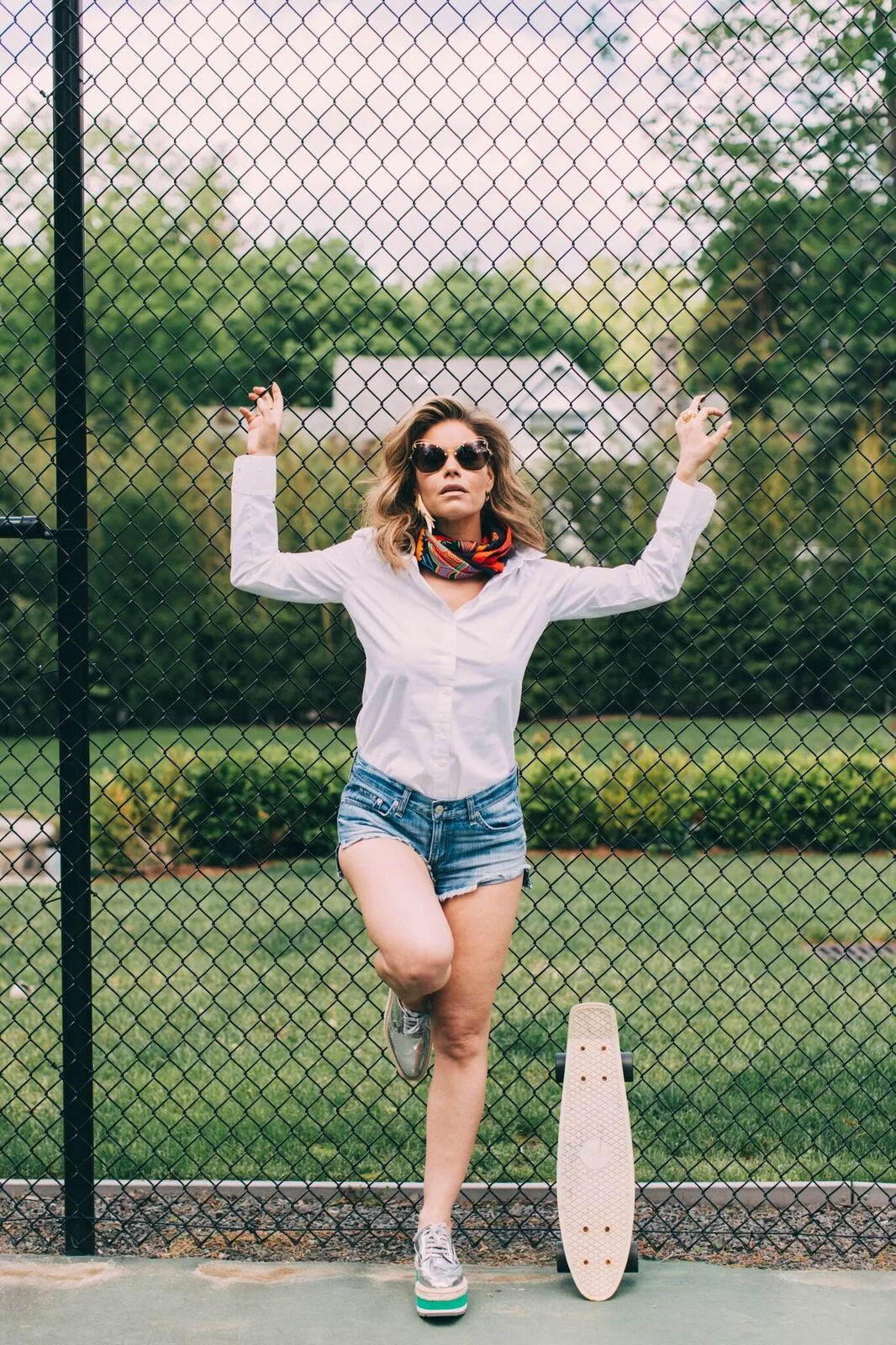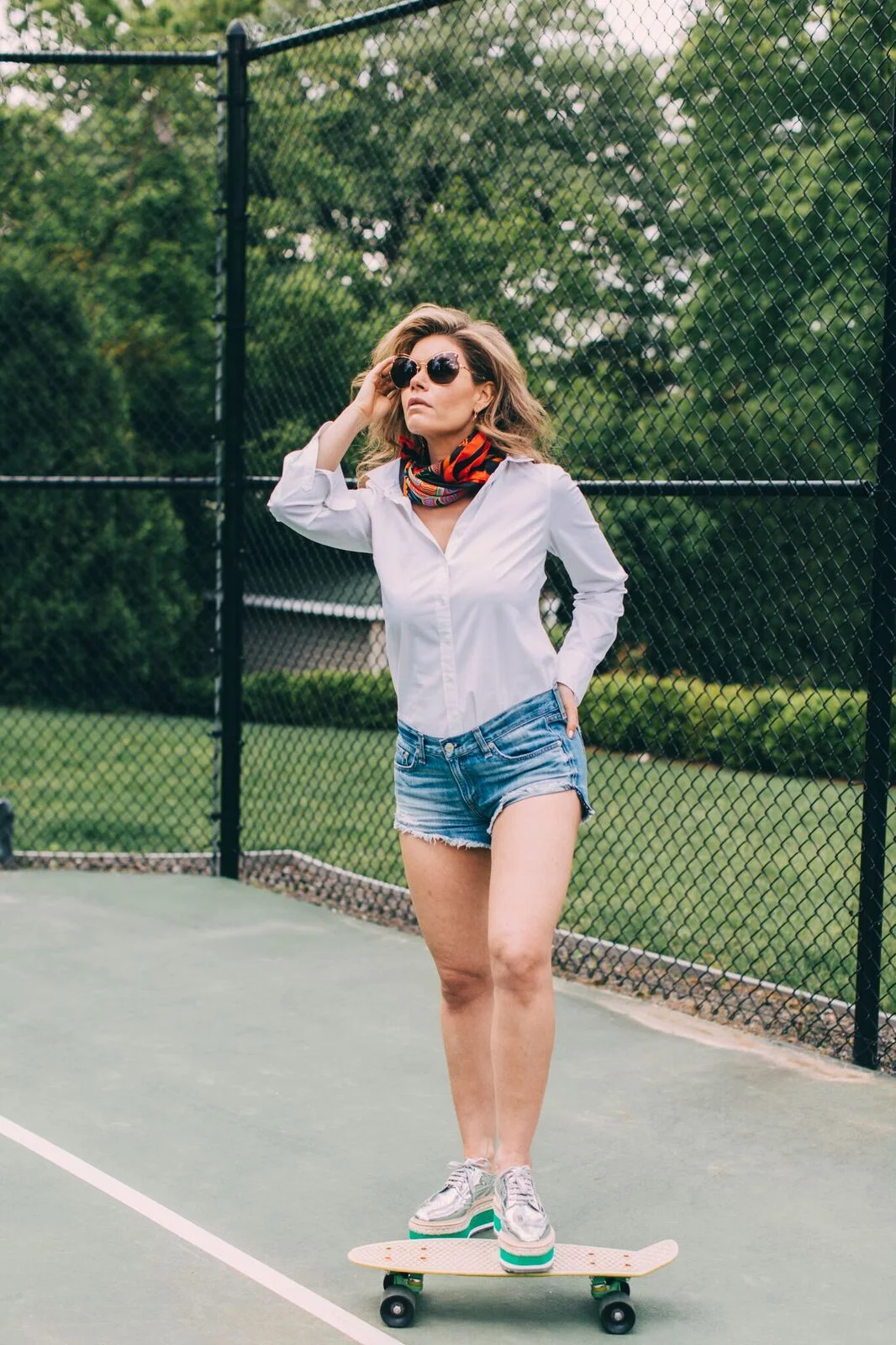 The shoes here are platform oxfords. The bright green in them work well with the strong colors in the scarf. Same color family. The Oxford is another classic style, which compliments the shorts and shirt. A word about these shoes; they're driving me crazy. I bought them in January. Prada new collection. As rad as they are, and as badly as I want to wear them, they sound like like I'm walking on whoopee cushions. It's mortifying. I'm so annoyed I succumbed and bought them, I believed the sound would go away, as the salesman promised. They sit in my closet giving me the finger,"you know you want us, but you can't really wear us". They were expensive, I was gullible. If anyone has any tips of how to avoid sounding like a gaseous nightmare while wearing these puppies, PLEASE share.  It's too late to return them, and they do look super cool. Sometimes fashion can trump dignity, but this is extreme. Help‼️.