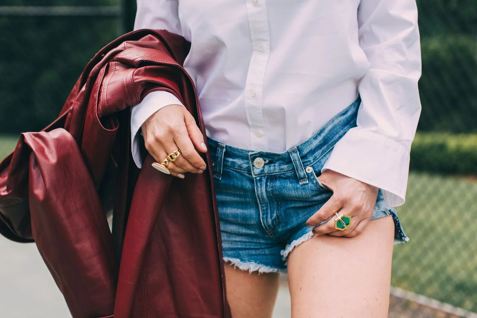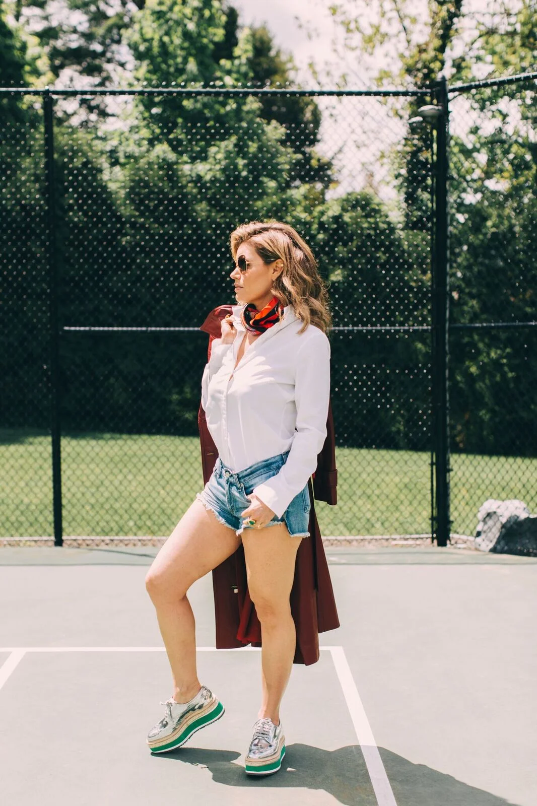Rachel captured each style so individually, and she nailed the creative vibrancy of the day. The first second we met, we hugged it out, and that was it. Hugs lead to great things😀. I am a huge fan of this look, since the building blocks are two of my most used items in my wardrobe; denim cut offs and a crisp white button down shirt. Classics to the max. With those as your starting points, it's almost impossible to F it up. When in doubt, stick just with that and you'll still look amazing. Promise. A good, clean tuck is needed here to balance out the volume of this long, leather trench. This ox blood colored leather is amazing. It's so strong yet somehow not in your face. Without the trench, the outfit can totally be Spring/Summer. This is not a warm weather coat, it's more for when temperatures start to dip. The heavy leather is too much for when it's hot out. This ensemble can easily be worn all year, just swap jeans for the shorts. Easy. A bold printed silk scarf tied around the neck with the ends tucked in made me feel like Grace Kelly, or a stewardess. I don't mind either😜.