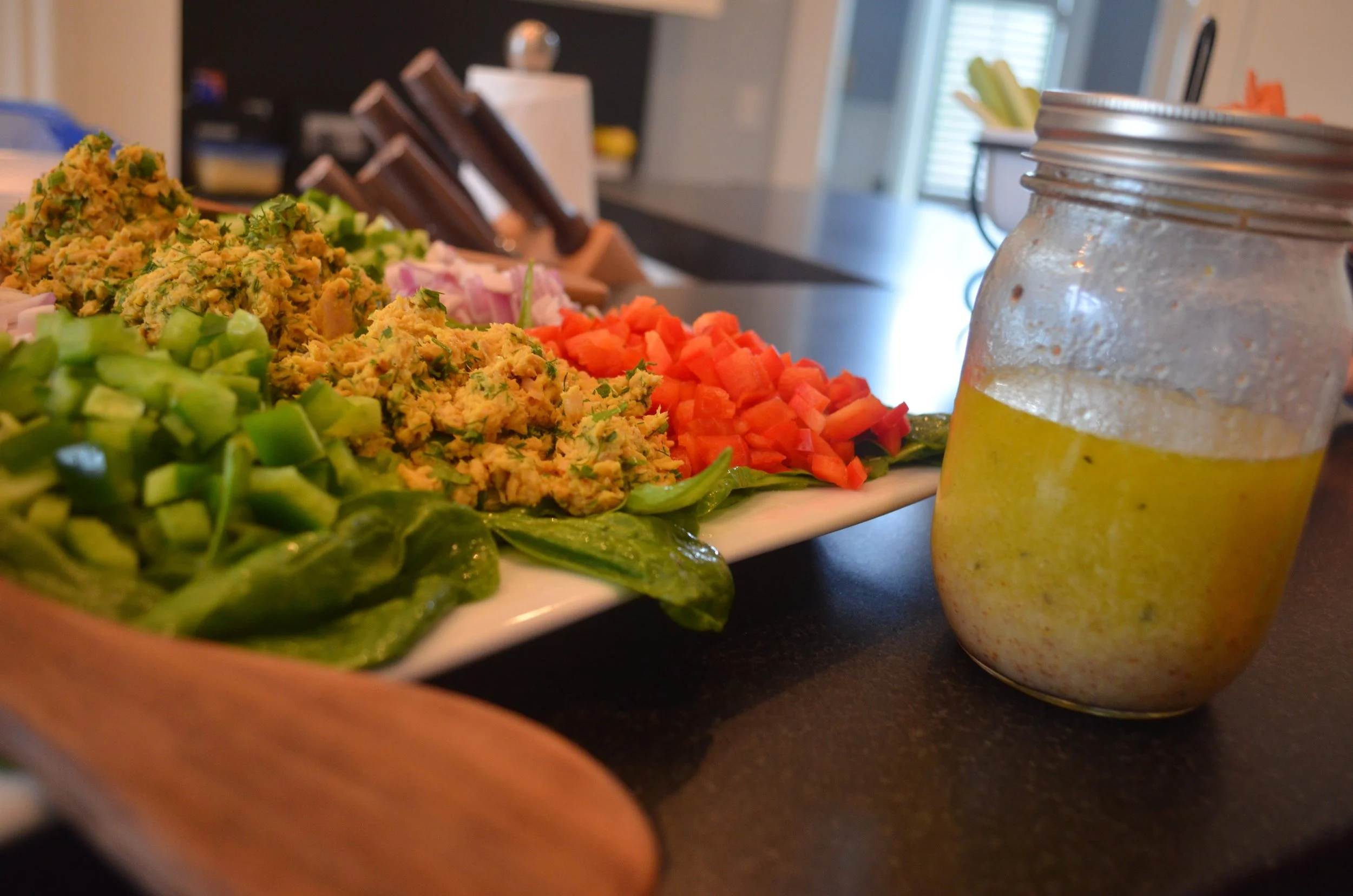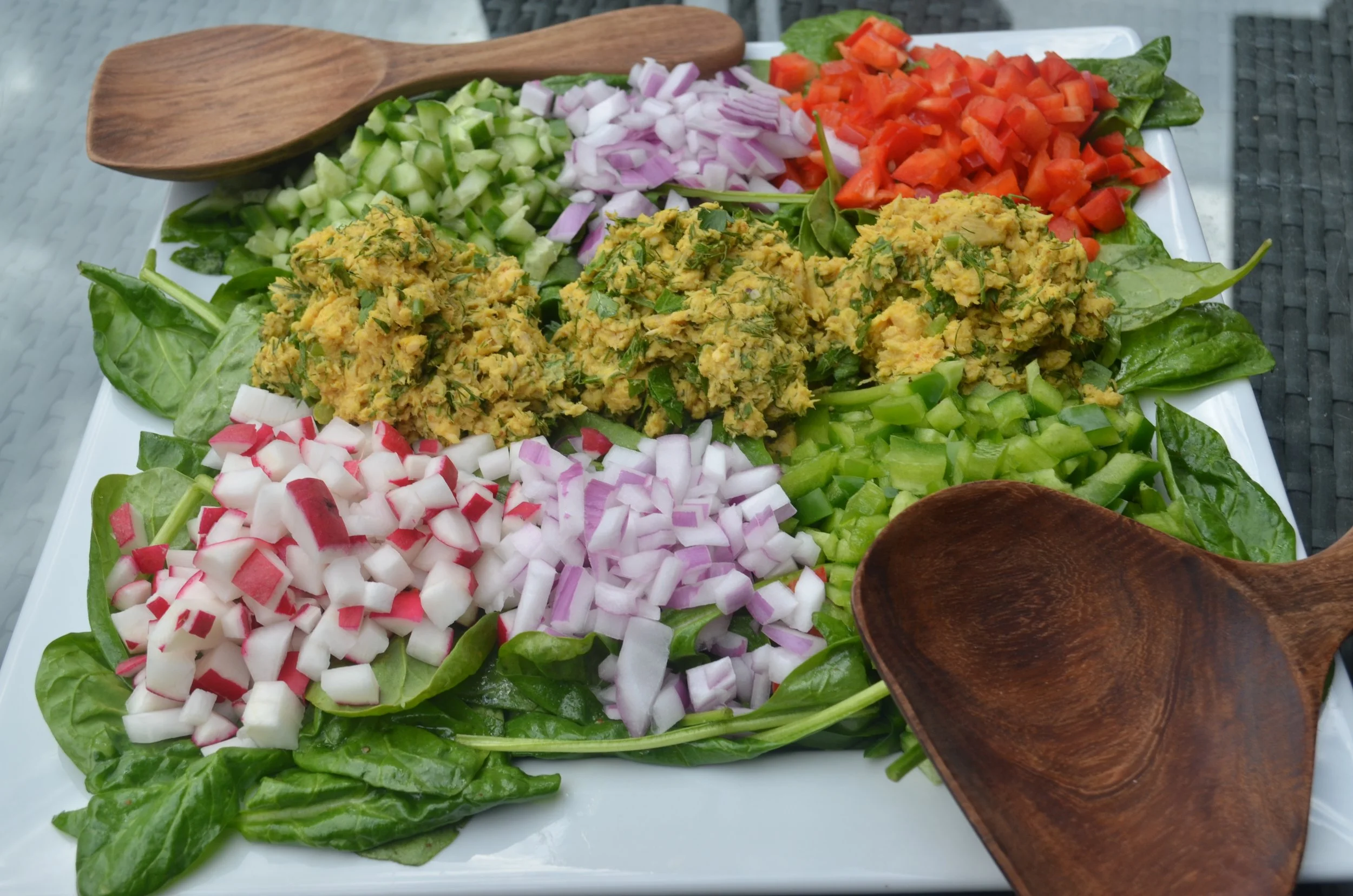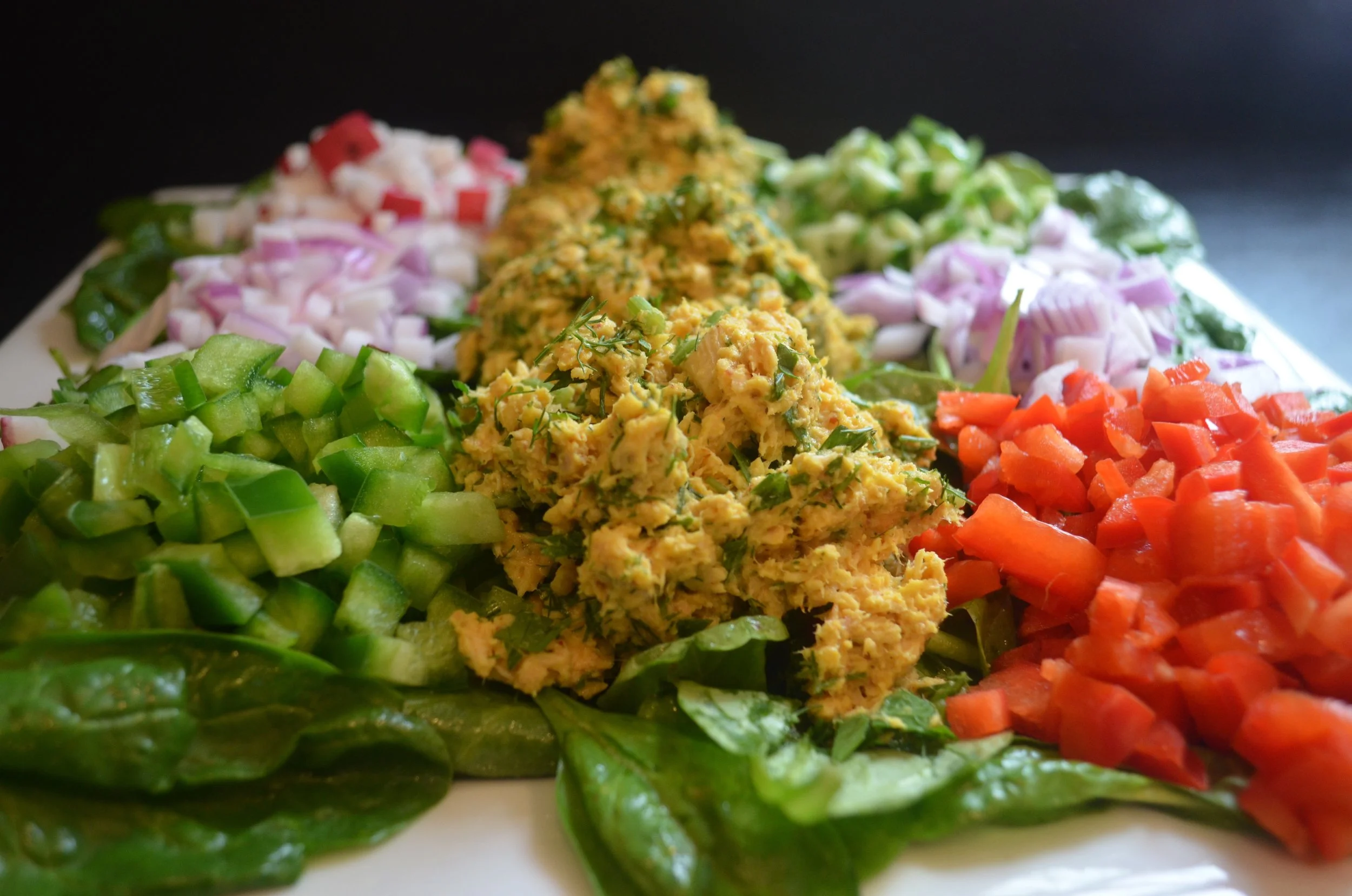 Again, my favorite is a white platter always. It highlights the freshness. Choose five different kinds of colorful veggies, and dice. Or buy pre diced like I did😜. Who wants to stand there chopping for so long? The dicing really does present beautifully though, so it's worth it. Pile each vegetable on its own atop the greens, using the colors as a pattern. For example, don't put red peppers and tomatoes next to each other. Spreadout your colors. Leave a space in the middle for neat scoops of tuna. After you've assembled , drizzle more dressing on top and sprinkle some extra fresh herbs. Feel free to sprinkle toasted slivered almonds on top as well. That's all, Folks! Pretty, fresh, visually appealing, the only requirements for a light meal, in addition to tasting delicious. This is so healthy, your body and metabolism will thank you. Even an old standby has room for fine tuna-ING. Eat well, feel well, live well.